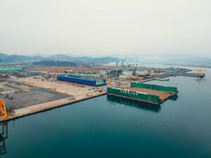 To help the shifting of the dock, three South Korean heavy-lift specialist companies – Anjeon, DaeMyung, and Global – aligned their fleets of Cometto’s SPMTs to shift the construction and move it 300 metres out of its installation location and onto the barge ship.