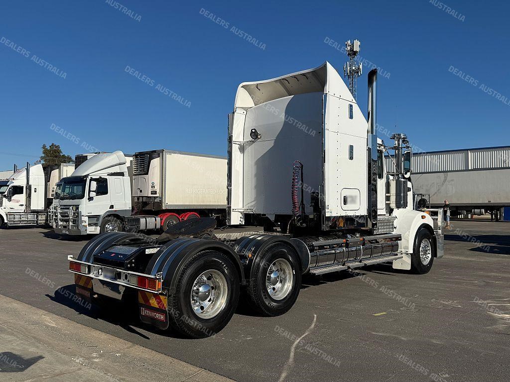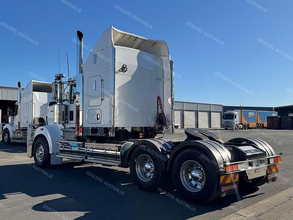 2015 Kenworth T909 6x4 Prime Mover, Cummins ISX E5 Engine @ 550Hp, 18 Speed Road Ranger Transmission, Meritor RT46-160 Rear Axles on Kenworth Air Glide Air Bag Suspension, Polished Alloy Bull Bar with LED Spot Lights, Plastic Bug Off, Stainless Steel Drop Visor, Dual Exhaust 10 Stud Alloy Wheels with Super Singles to the Steer, Square Tanks, Stainless Steel Drive Guards, Aero Kit with Wings, Holland Fixed QRTT, Custom Air Bunk Cooler, Chassis Deck Plate, Maroon Diamond Stud Trim, Air Ride Drivers Seat, Wood Grain Dash, Radio Cd Player, A/C, Power Steering, Turbo Timer, Microwave,