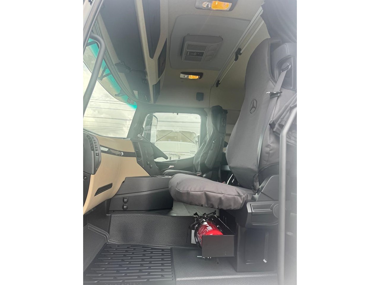 Cabin - Kerb mirror and main mirror, manoeuvring setting, co-driver's side - Driver and co-driver sunblind - Seat belt monitor - Air horns, cab roof - Air deflector, snap-in, with cab side deflectors - Sun visor exterior transparent with chrome highlight - TrendLine interior design with ambient lighting, chrome trim, carpet on engine tunnel - Leather steering wheel - Driver and co-driver air sprung comfort leather suspension seat - Luxury bed, bottom, inner spring - Luxury bed, top, wide, with levelling control - Multimedia Cockpit, interactive - Comfort telephony, wireless charging - Cruise control and speed limiter - Travel computer, on-board diagnosis and maintenance system - Truck navigation - DAB radio - Premium loudspeaker system with additional speakers - 24 V/15 A co-driver footwell sockets - Automatic climate control - Pull out tray table on passenger side - Stowage flap and compartments above windscreen - Stowage compartment exterior flap, left and right - Mercedes star, illuminated from behind in dark chrome - Dark chrome badging - Two 30 l pull-out refrigerators under bunk