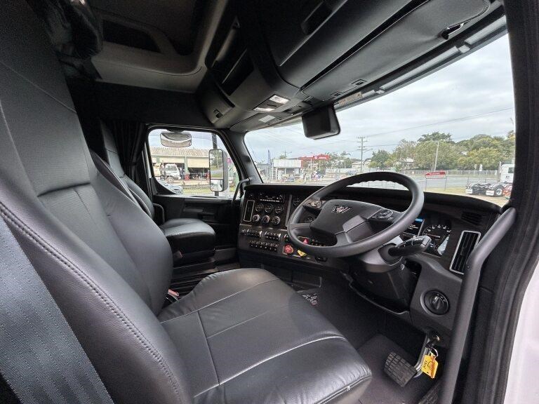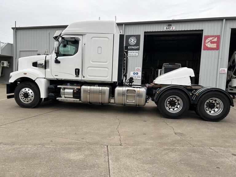 49X long bonnet with 48" mid roof sleeper, Detroit DD16 600hp @ 2050lb/ft, 12 speed automated transmission, Meritor RT46-160GP diffs , 1820lts fuel, Jost fixed turntable, alloy walk plate, Plastic drive guards and UHF radio