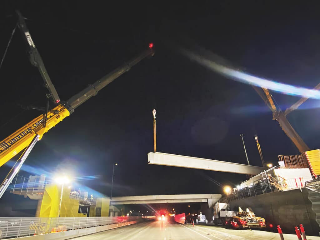 The two-span bridge consists of 7 girders per span with each girder weighing 85 tonnes, a total of 14 girders.