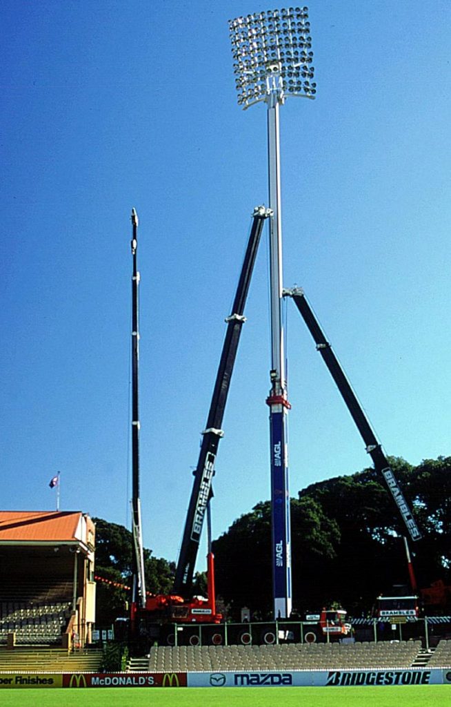 While the seized light tower added greatly to the complexity of the lift program at the Adelaide Oval, the entry covered the full program of removing and replacing four light towers, and it was necessary to bring the 400t crane to Adelaide for lifts of the 19t light fittings at the top of the new towers. However, the lift program was organised so that all removal work and erection of tower sections could be undertaken with local cranes, and the light fitting erections could be undertaken with a single short-term visit by the 400t crane.